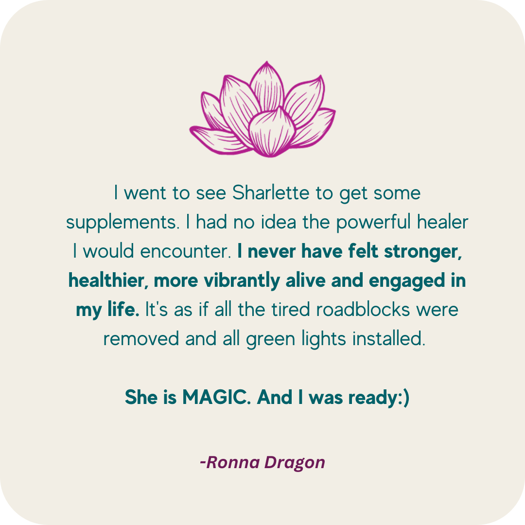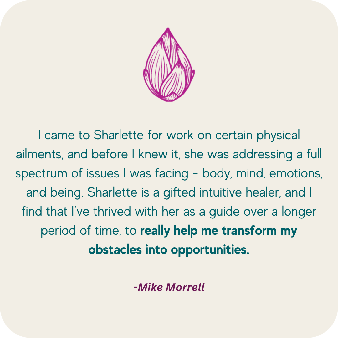 How do I speak about the most profound life experience I’ve ever had? How do I put into words an experience that there is so often, no words for? Sharlette has held my hand and guided me on my journey back to health, love and peace. With both myself and the outer world. She is now my friend, mentor, life coach, spiritual guide and medical intuitive….Anytime anyone I know is suffering with any kind of life experience, I refer them to Sharlette. She has walked me back home, to myself and I will be forever grateful.
