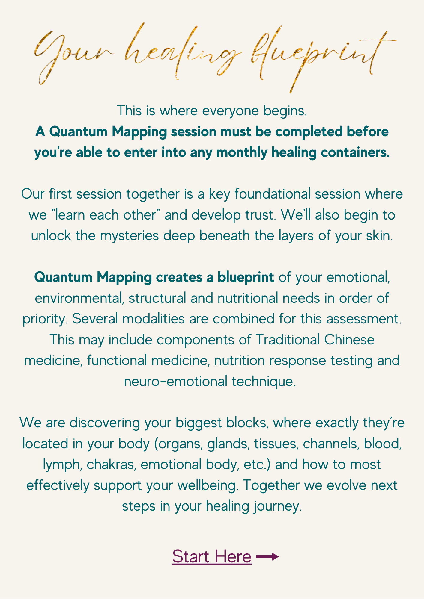This is a process of guided wellness wherein I draw wisdom from your body consciousness via the nervous system, reading your energy signature and sometimes speaking with your ancestors, guides and guardians. Then through coaching and quantum mapping, we determine the most sustainable and impactful way to support transformation and healing for you. This is NOT “one size fits all.”All of this wisdom informs the process through which I coach and support your healing in a way that leads to sustainable transformation and healing.